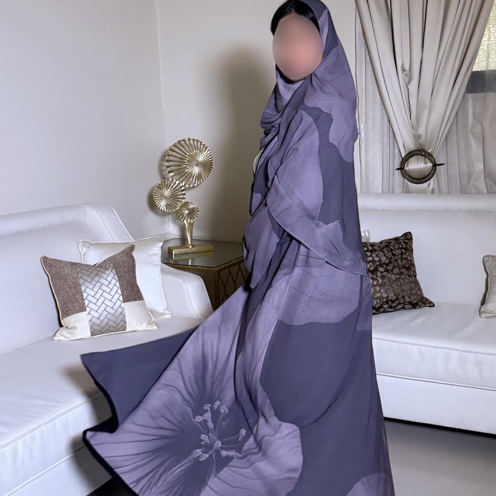 الوان العباية : جهه شيفون رمادي مع ورد موف فاتح - الجهه الثانية شيفون اسود
