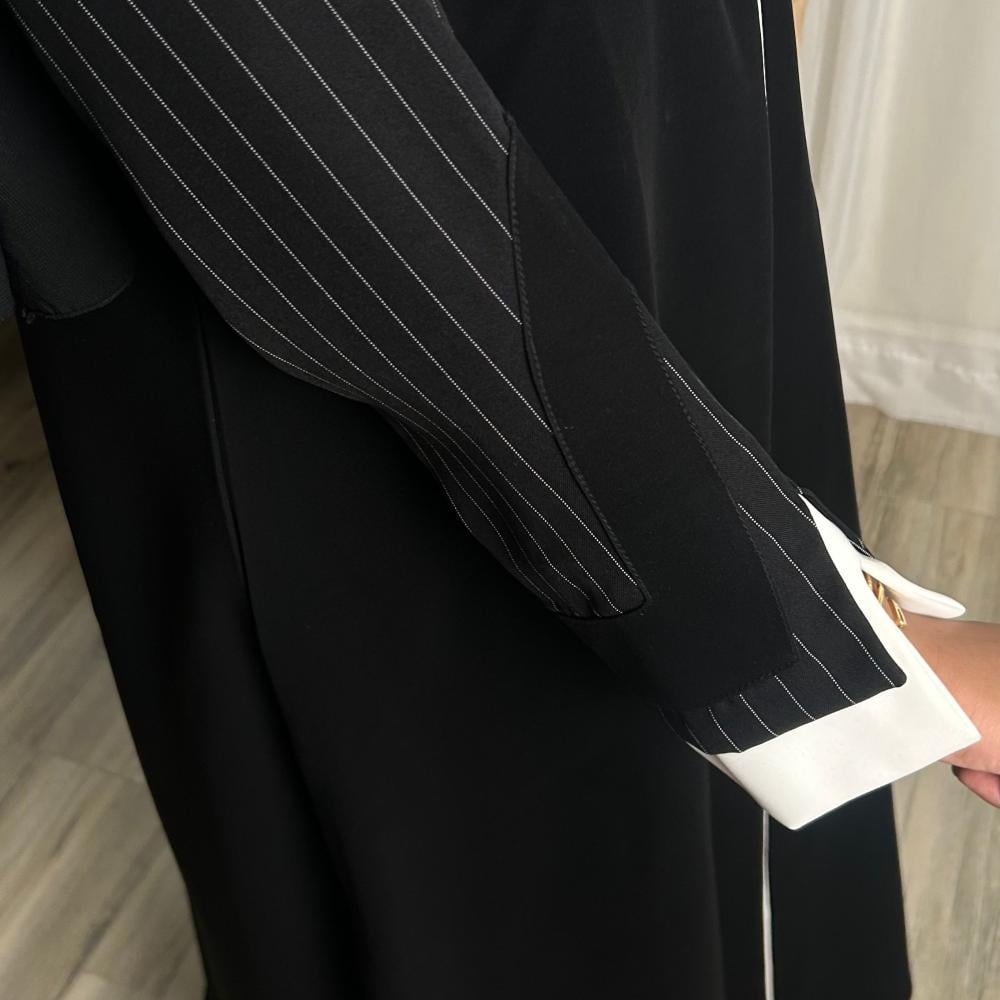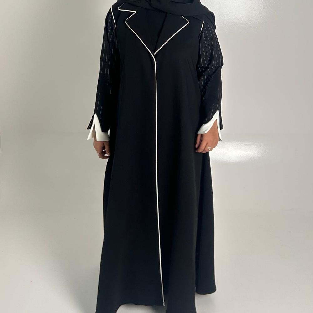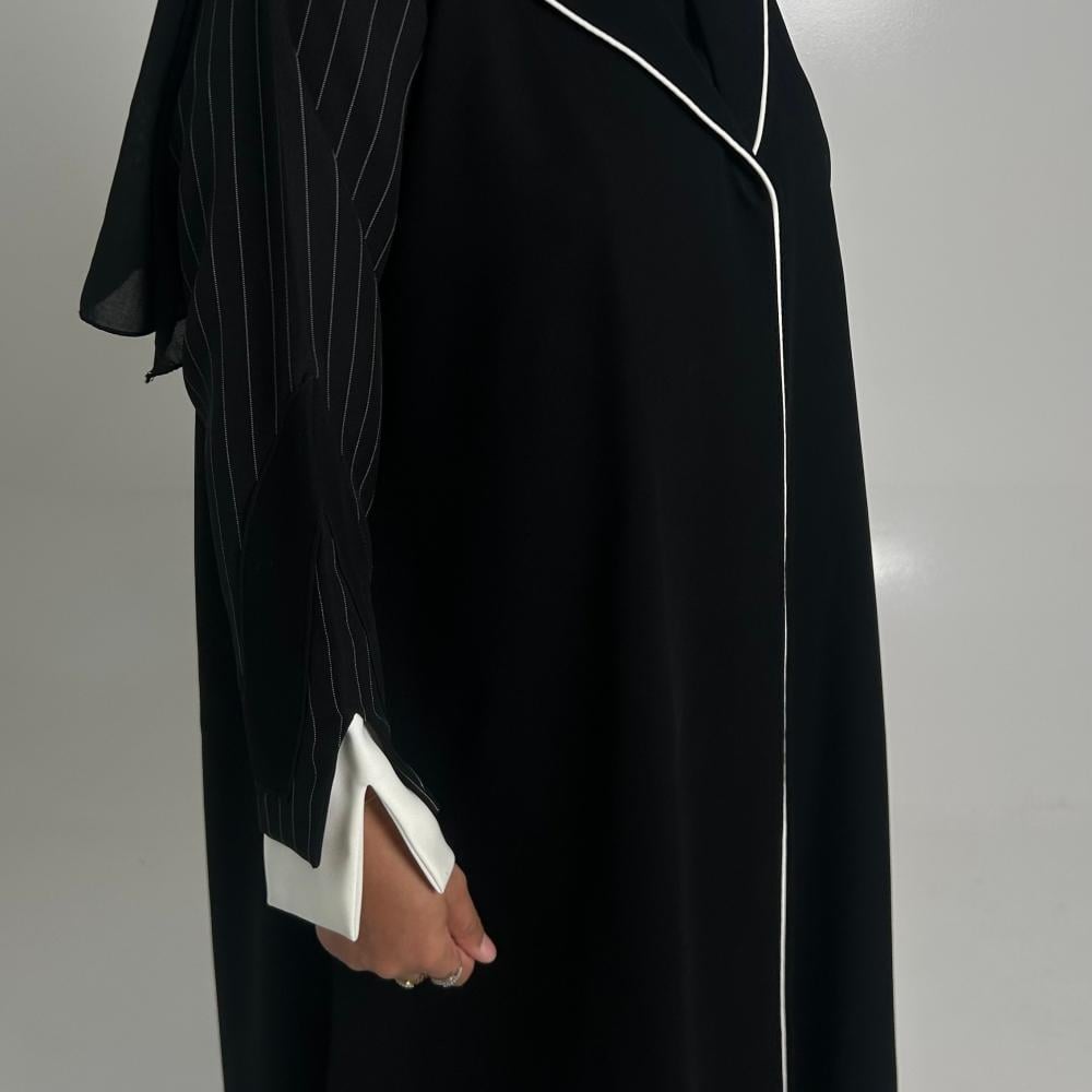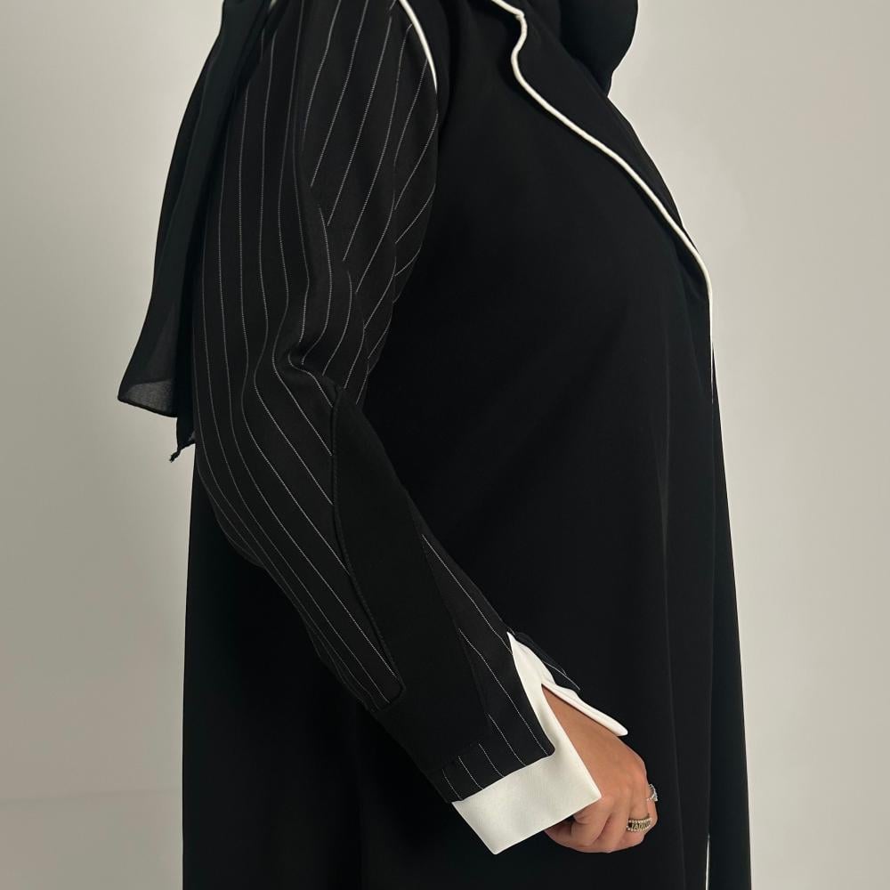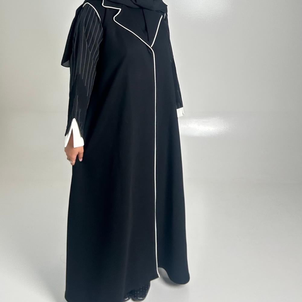 لون العباية: اسودقماش العباية: كريب سيراميك اندنوسي - و قماش اسود مقلم بالابيضقصه العباية : نص كلوشيوجد تعديل على قصه العباية - عرض و طول العباية