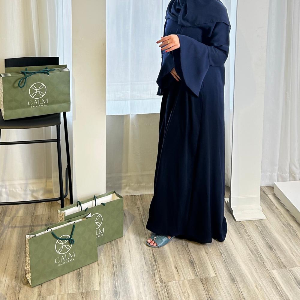 عباية نص كلوش قماش العباية : كريب اندنوسيالاكمام : مبطنه من الداخل بقماش شيفون كحلي فاتح موضحه في الصورعدد الازرار : ٢ يوجد تعديل على قصه العباية - عرض و طول العبايةموضح في الصور لونين اسود - كحلي و تتوفر بعده الوان اخرى